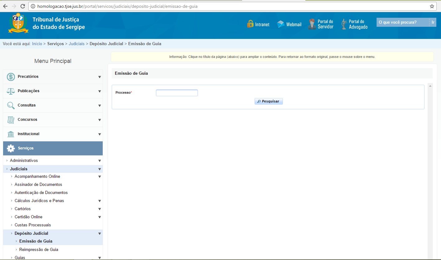 Com esse sistema, a parte interessada acessa o Portal do TJSE (www.tjse.jus.br), clica no menu 'Serviços', depois em 'Guias' e por fim clica em 'Depósitos Judiciais'. Na tela seguinte, preenche a guia e depois imprime o boleto bancário, pagável em qualquer agência bancária.