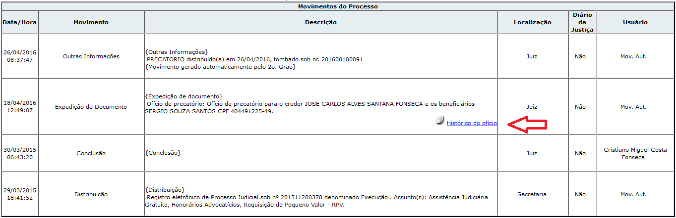 Como o fluxo de confecção do ofício é paralelo ao andamento processual e, por isso, não será registrado na consulta ordinária de movimentação, o ofício precatório deverá ter seus estados devidamente registrados e permitir a consulta de seu histórico.