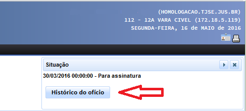 O histórico de situações do ofício poderá ser acessado de duas maneiras. A primeira, através da consulta ao ofício preenchido, pelo botão