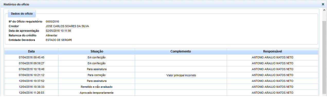 Ademais, aludidas situações são também registradas no respectivo histórico do ofício, composto pelos seguintes elementos: