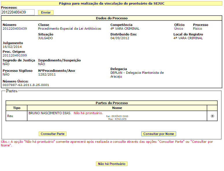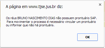 O prontuário SAP é exigido no primeiro cadastro de prisão. Não é exigido para prisões ocorridas fora do estado de Sergipe.