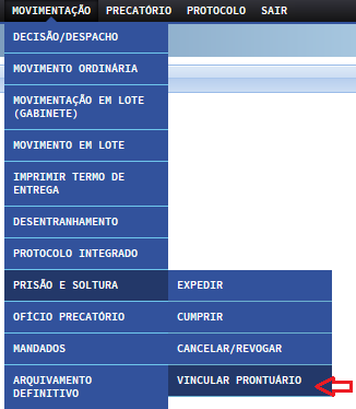 Em ambos os casos, a alimentação será feita através do menu Movimentação> Prisão e Soltura> Vincular prontuário.