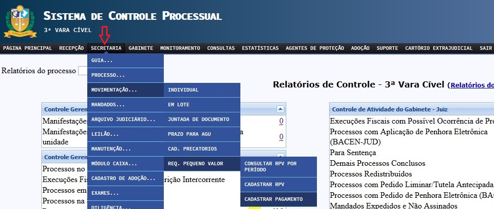 O sistema informatizado de controle processual das unidades jurisdicionais disponibilizará o menu REQ. DE PEQUENO VALOR através do menu SECRETARIA>MOVIMENTAÇÃO e possibilitará ao usuário da Unidade Jurisdicional consultar a RPV por período, cadastrar a RPV e cadastrar o pagamento.
