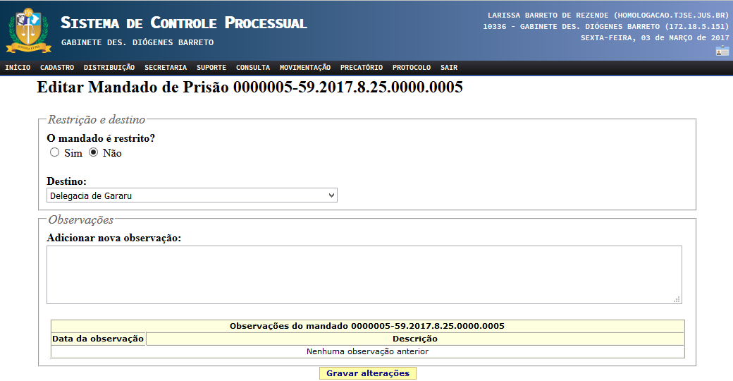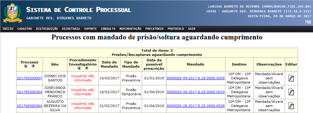 Verificado erro no cumprimento do mandado de prisão - citando-se, dentre outras hipóteses, o caso de a autoridade policial apor certidão (no lugar do ciente do acusado/réu) informando que o indigitado não se encontra mais custodiado em sua unidade, além do local para o qual o mesmo foi recambiado - o usuário poderá reencaminhar o mandado de prisão para a autoridade policial, via Sistema de Controle Processual/Portal Criminal, através do relatório gerencial "Prisões/Solturas aguardando cumprimento”, clicando no ícone "Editar”, e encaminhando para o destino indicado na certidão - evitando-se o retrabalho da reexpedição do mandado prisional.