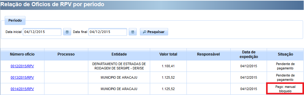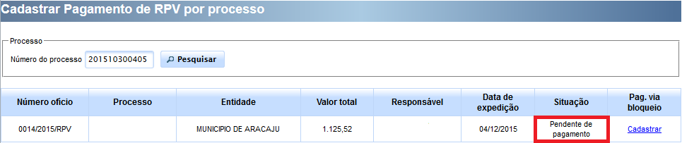 Ao clicar em “cadastrar” e alimentadas as informações de pagamento, a situação do ofício passará de “Pendente de pagamento” para “Pago: manual bloqueio”, assim como demonstrado nas imagens abaixo.