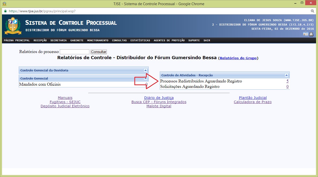 Atenção! Faltando pelo menos um dos requisitos acima, o processo não poderá ser redistribuído pela Recepção/Distribuição do Fórum. Neste caso, o distribuidor deverá entrar em contato com a Vara de Origem para solicitar a regularização das informações no sistema. Lembrando que se o processo não estiver com ultima localização 'Secretaria', a Vara de Origem deverá gravar o movimento 'Recebimento', para então corrigir as informações no Sistema de Controle Processual.