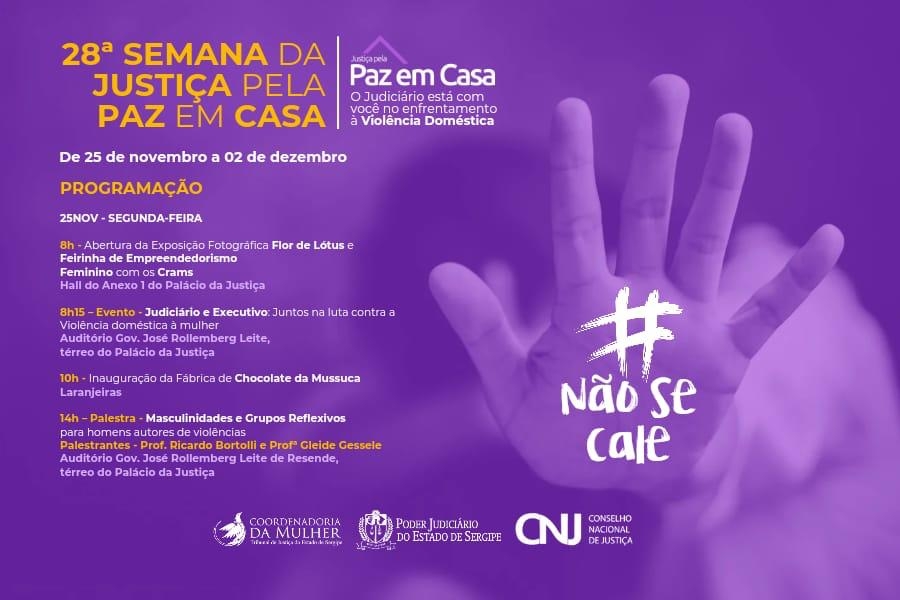 A 28ª edição da Semana Justiça pela Paz em Casa acontecerá de 25 de novembro a 2 de dezembro. Em Sergipe, a programação é organizada pela Coordenadoria da Mulher do Tribunal de Justiça de Sergipe (TJSE) e contará com realização de feirinha de empreendedorismo, inauguração de fábrica de chocolate, palestras, cursos, entrega do Selo Amigo da Mulher, projeto Matemática do Amor em escola municipal, entre outras ações.