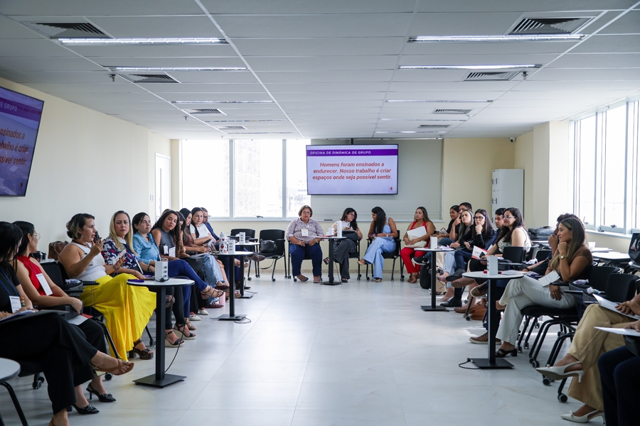 Uma das profissionais que está participando do encontro é a assistente social Mayara Reis. Ela atua no grupo reflexivo do município de Estância, que existe há cerca de dois anos. O grupo recebe homens encaminhados pelo Poder Judiciário e tem encontro semanais, sempre nos finais de tarde, para facilitar a presença dos homens. Além dos tipos e ciclo da violência a equipe psicossocial discute com os participantes temáticas transversais relacionadas à masculinidade.